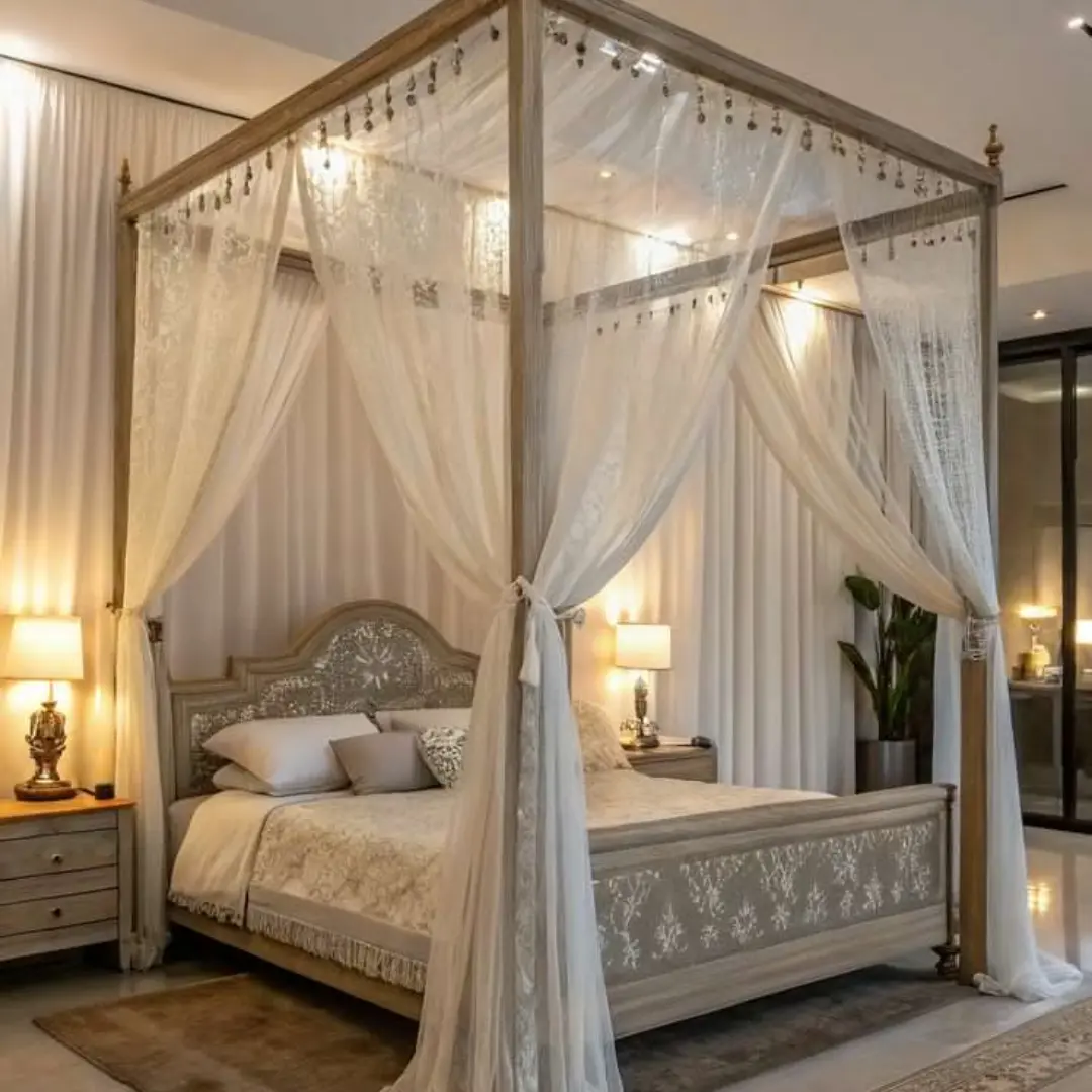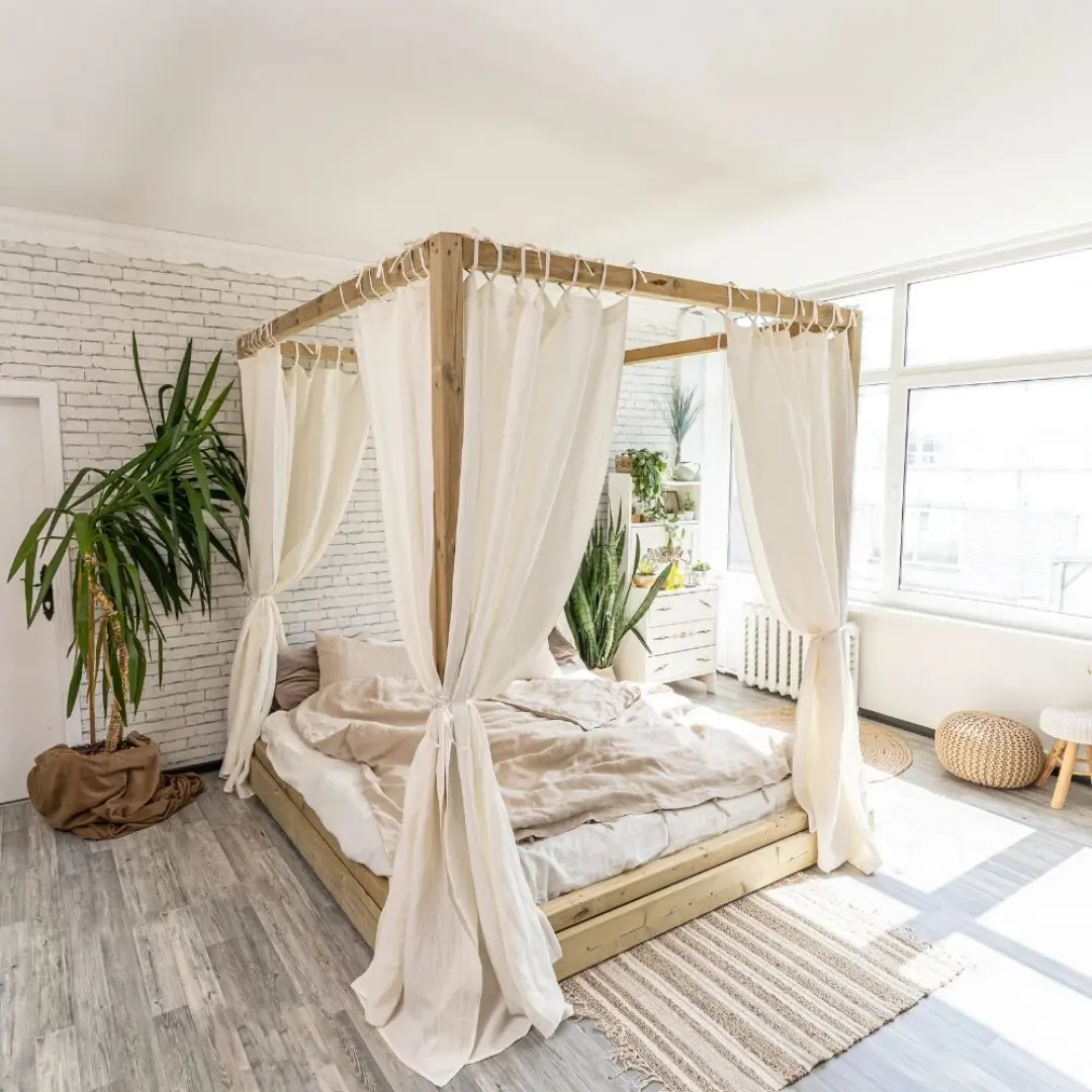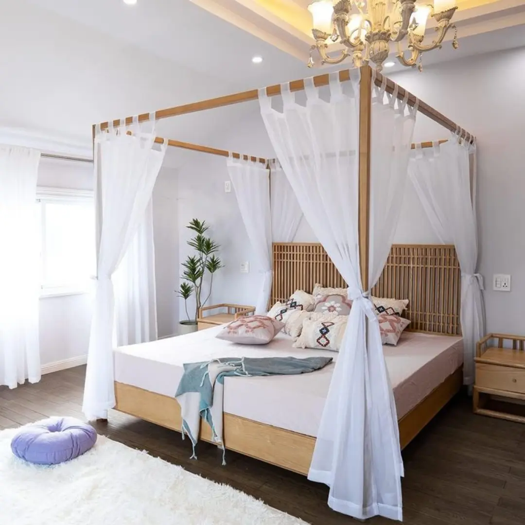 You can use canopy curtains for privacy, dust cover, mosquito netting, or as a decorative focal point. Our experts suggest mixing sheer front panels with heavy liners for sleep comfort or plain panels for a modern, minimal look. Many customers mix layers depending on the season; you can swap sheers in summer and liners in winter. It’s easy to switch panels by season; many residents do this yearly.