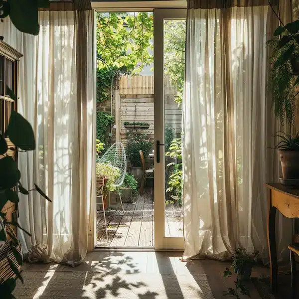 Door drapes reduce visibility from outside and allow controlled sunlight without blocking natural brightness completely.
