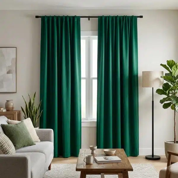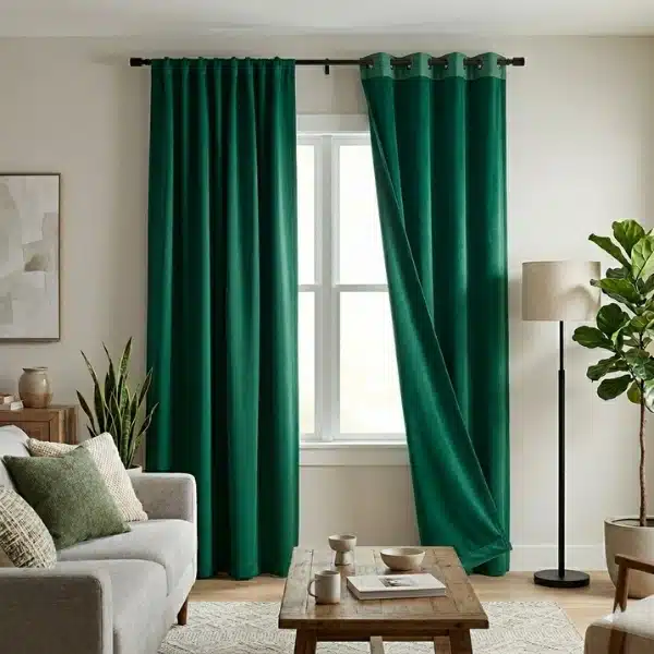 Upgrade your space with the elegant Emerald Green Thermal Blackout Curtain. Its rich green tone brings a luxurious touch to any interior while delivering superior light blocking and noise reduction. Crafted with thermal fabric, it helps regulate indoor temperature for year-round comfort. Perfect for bedrooms, living rooms, or offices, it combines style, privacy, and functionality.