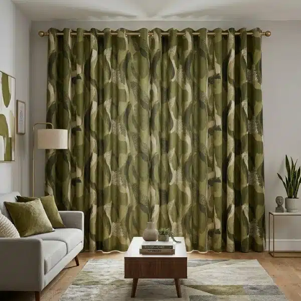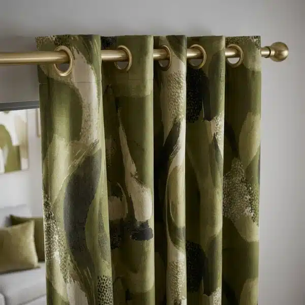 Enhance your interiors with Olive Abstract Eyelet Curtains Abu Dhabi. Made from premium 100% cotton, these curtains showcase a modern abstract pattern in calming olive tones. Designed with stylish eyelets, they provide privacy, light control, and effortless elegance, making them a perfect choice for any contemporary living space.